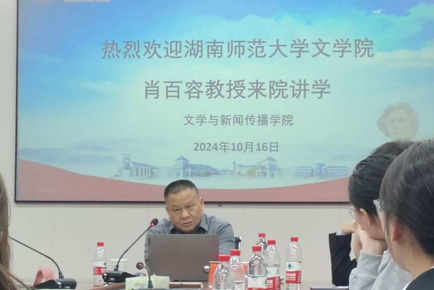 2024年10月16日,湖南师范大学文学院院长、博士生导师肖百容教授应邀在玉衡楼201室为伟德国际victor1946网页版开展题为“经典与细读——以《边城》为例”的学术讲座。龙永干院长、杨水远副院长、汉语言文学系主任卢阿涛老师、杜娟老师、22级润之英才班及22级汉语言文学班学生100余人参与此次活动,本次学术讲座由龙永干院长主持。