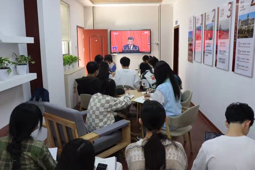 研讨室喜气洋洋、气氛热烈,大家怀着无比激动的心情收看二十大直播,特别是习近平总书记的报告,大家认真聆听,细心体会,不时响起热烈的掌声。