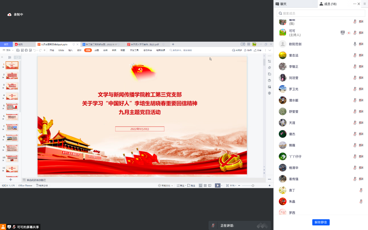 2022年9月20日晚7点,伟德国际victor1946网页版教工第三支部以腾讯会议的方式组织开展了9月主题党日活动。本次活动以“学习习近平总书记给‘中国好人’李培生、胡晓光重要回信精神”为主题,活动由支部书记谢亚可同志主持。