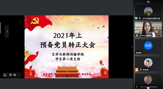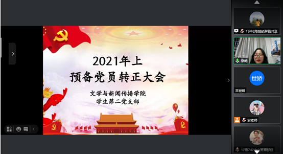 为进一步贯彻落实中国共产党在大学生队伍中高质量发展的方针和政策,壮大BETVLCTOR伟德在线文学与新闻传播学院的学生党支部力量。2021年5月10日晚19:00,BETVLCTOR伟德在线文学与新闻传播学院学生第二党支部在腾讯会议召开预备党员转正大会。