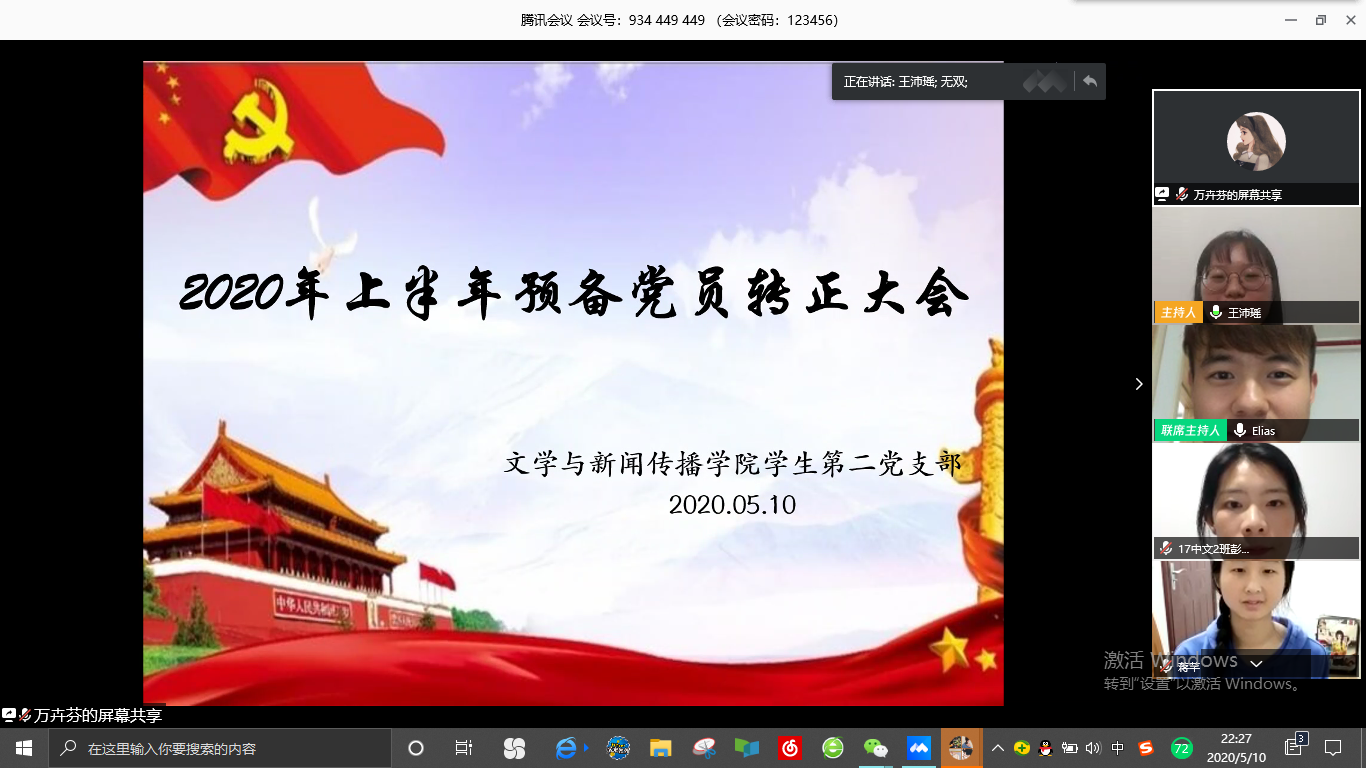 2020年5月10日,文学与新闻传播学院学生第二党支部以线上会议的形式召开了预备党员接收及预备党员转正大会。学生第二党支部书记安炜成老师、副书记赵雅兰老师、学生第二党支部全体学生党员和本批次的发展对象参加会议。安炜成老师主持本次会议。