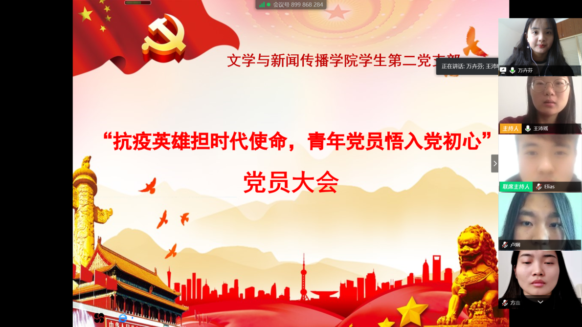 2020年4月13日晚上7:00,为了学习抗疫英雄的伟大事迹,提高青年党员的使命意识,发挥先锋模范作用,伟德国际victor1946网页版学生第二党支部通过腾讯会议召开“抗疫英雄担时代使命,青年党员悟入党初心”党员大会。学生第二党支部书记安炜成老师,副书记赵雅兰老师,以及学生第二党支部全体学生党员参加此次大会,大会由安炜成老师主持。