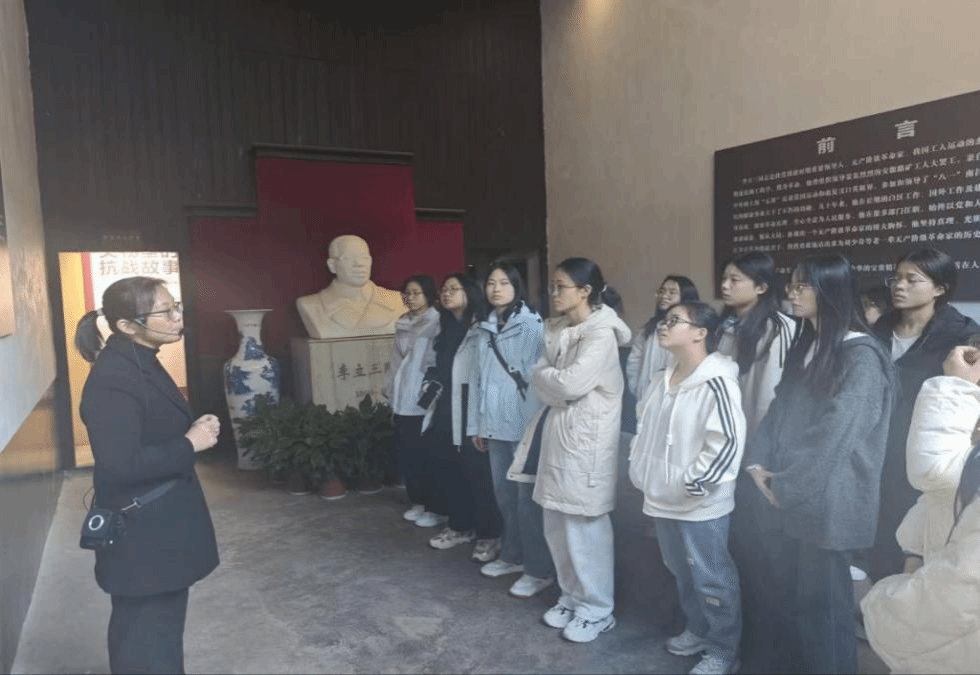 随后,研学队伍前往李立三同志故居。故居门楣上“芋园”二字古朴庄重,“李立三同志故居”匾额熠熠生辉,院内古柏铁树静立,见证历史沧桑。同学们驻足于200余幅图片、230多件文物资料前,深切感悟这位工人运动先驱“投笔效班侯,工运领先锋”的革命豪情与为民情怀:他效仿古代贤臣班超,毅然投笔从戎,投身于波澜壮阔的工人运动之中,成为引领工人阶级斗争的先锋人物;同时,他为争取工人权益、推动社会进步也付出了巨大努力和崇高牺牲。