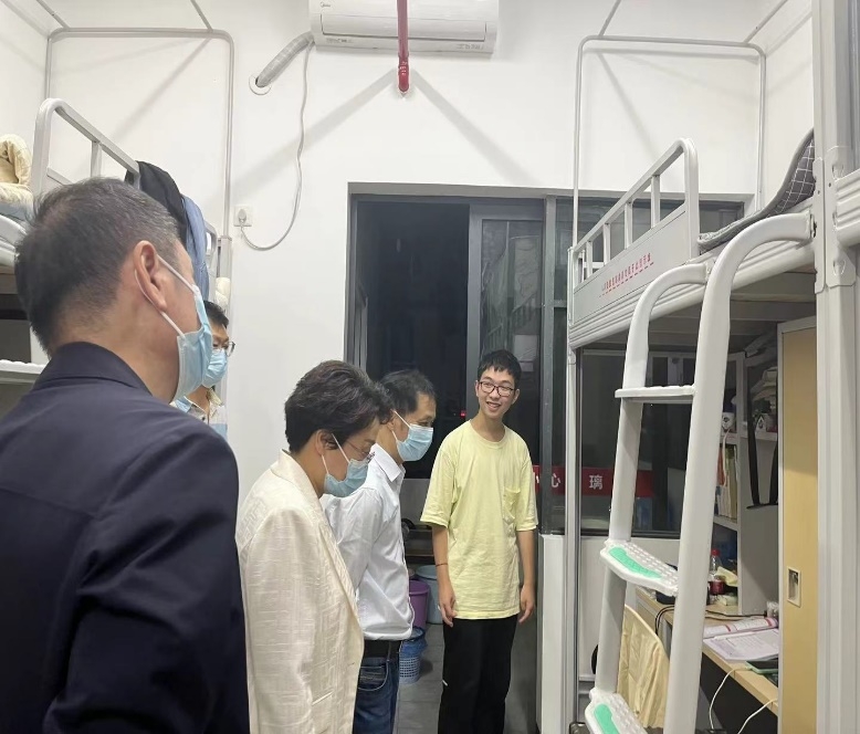 2023年9月27日晚,校党委委员、纪委书记李昱带领文学与新闻传播学院党委书记何培森、院长龙永干、党委副书记李豪杰及全体辅导员走访17栋学生公寓、怀中南教室、西门处商铺、国基广场超市、食堂等多处,深入调研关心学生新公寓设备设施使用情况、学生晚间学风建设情况和学生日常生活场所。