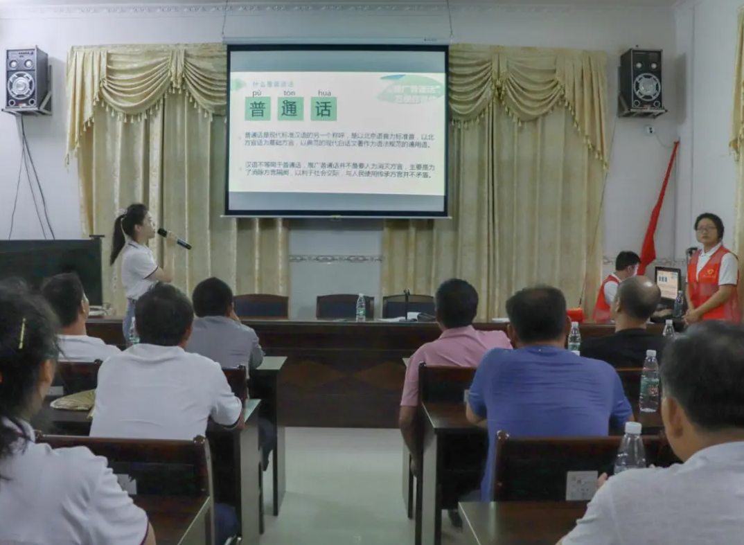 活动现场,队员首先向家长们介绍什么是普通话、推普的原因和意义,并组织大家学习《中华人民共和国国家通用语言文字法》,深入学习了解国家的语言文字政策,引导大家树立科学的语言观。带队老师李豪杰从法律和国家政策的角度,向家长们介绍普通话的重要地位。接着,队员又介绍了普通话帮助学生理解和学习知识,帮助村民利用带货直播让农产品“走出去”的实例,通过高质量推普,可以促进自身成长成才,促进语言文化和乡村特色产业融合发展,培育乡村经济新增长点,引导家长们更加重视家庭教育中的普通话学习,营造良好的语言氛围。