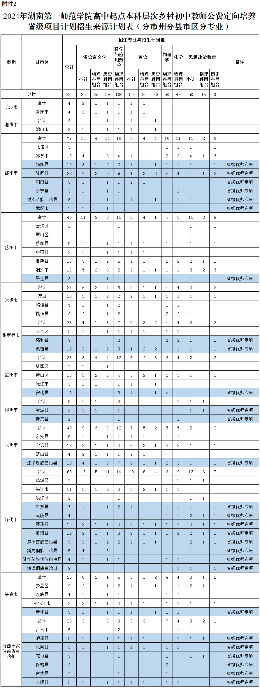 (二)本科层次初中教师公费定向培养招生计划:384人,其中省级优师专项200人。(详见附件2)