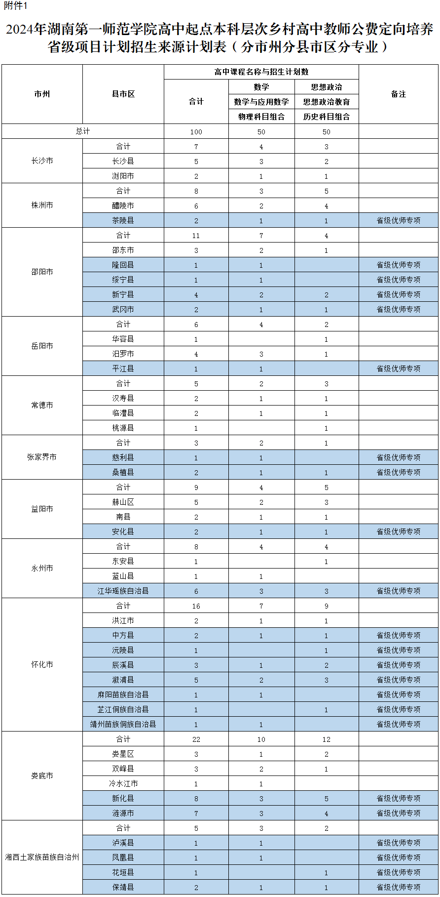 (一)本科层次高中教师公费定向培养招生计划:100人,其中省级优师专项56人。(详见附件1)
