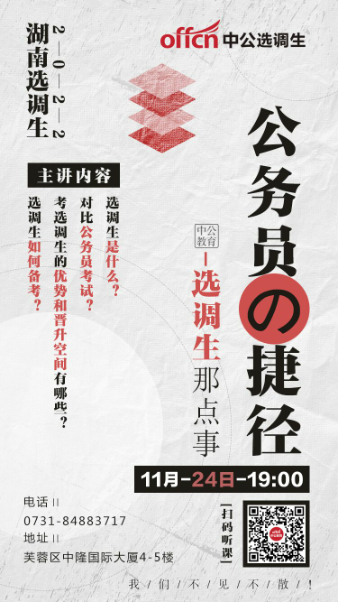 2022年湖南选调生考试预计月底发布,此次考试是一次考公务员的捷径,竞争小,提拔快。为帮助同学们全面了解选调生考试,提供新的就业选择,中公教育开展选调生线上备考指导讲座,具体安排如下,请大家积极参加:【讲座时间】:11月24日(周三)晚上19:00-20:30【讲座内容】:选调生考情分析+写作提升【报名方式】:扫描图片二维码/点击链接(http://19.offcn.com/class-364551/?scode=69bbZ)