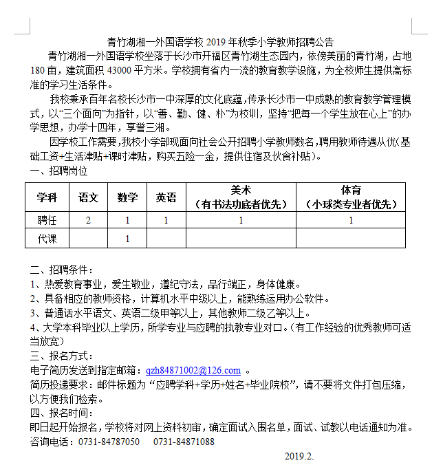 青竹湖湘一外国语学校2019年秋季小学教师招聘公告