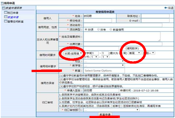 “借用时间要求”一定要选“长期-按周借”,再填写好对应的周次,如2-3(教室借用最大限度为两周,不能超过两周),选择“连续周”,再填写好对应的小节,如9-10。如果仅要申请某一单周,起止周与结束周相同,如5-5。