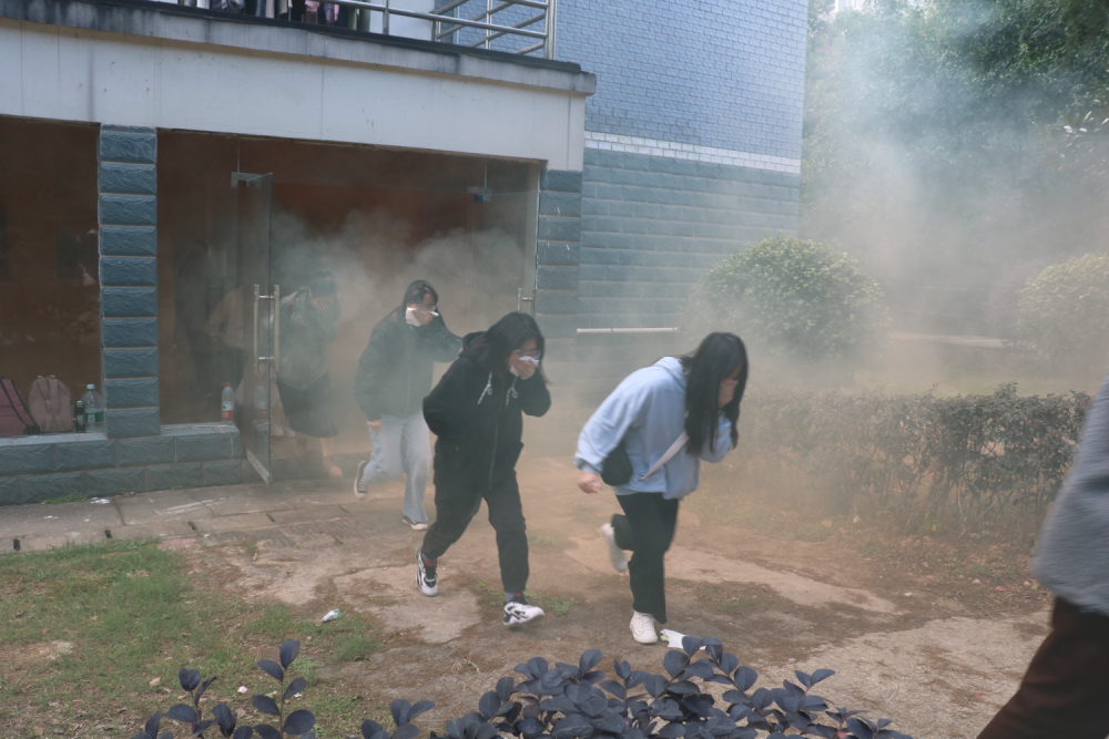 讲座之后,学院组织学生在7-8栋学生公寓举行消防紧急疏散演习。浓烟滚滚的宿舍楼内警铃响起,在教官和老师们的带领下,同学们迅速从宿舍楼内撤离到疏散集结地点。邹教官对本次演练进行了点评,强调紧急逃生过程中的注意事项,嘱咐同学们要将消防安全铭记在心。