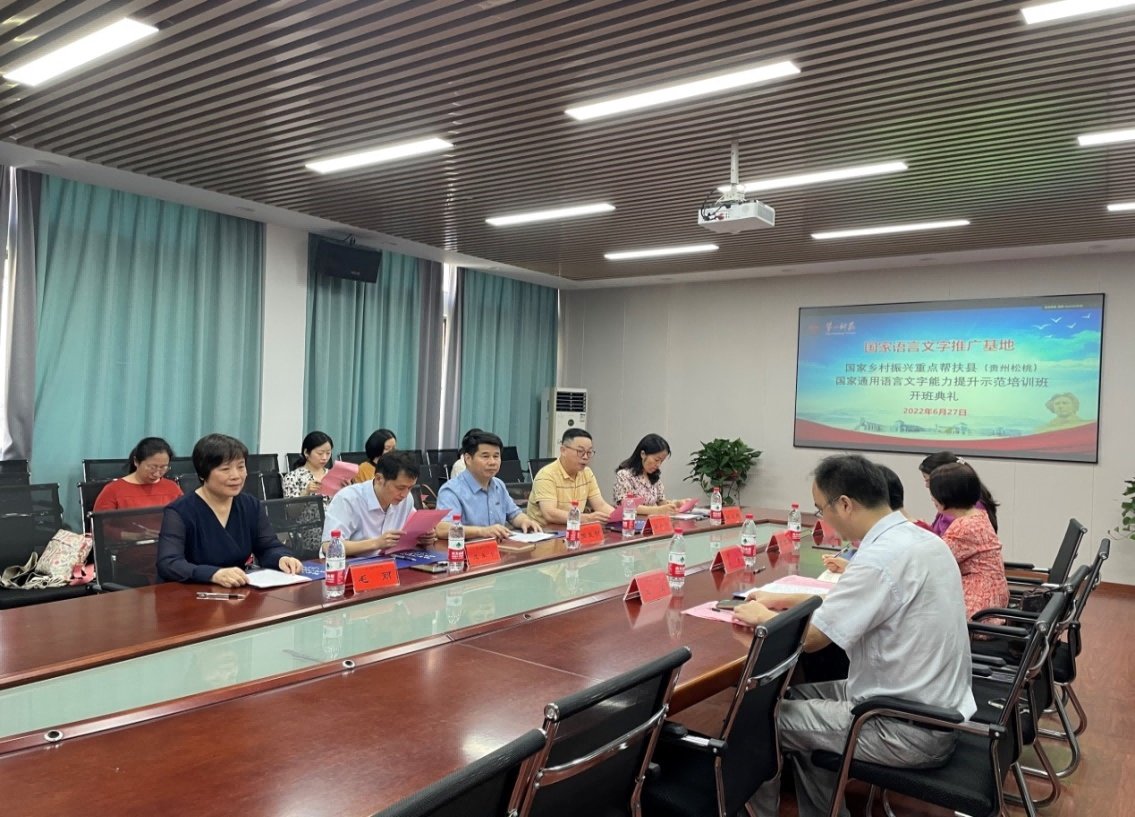 6月27日上午9时,BETVLCTOR伟德在线国家语言文字推广基地对口贵州松桃苗族自治县国家通用语言文字能力提升示范培训班开班典礼在玉衡楼201研讨室隆重举行。BETVLCTOR伟德在线党委委员、副校长周发明、教务处副处长廖小芒、项目负责人、文学与新闻传播学院院长龙永干、贵州松桃苗族自治县教育局副局长杨赟等相关领导出席,20余名项目团队教师、100名松桃县中小学教师学员参加了开班典礼。典礼由教务处副处长廖小芒主持。